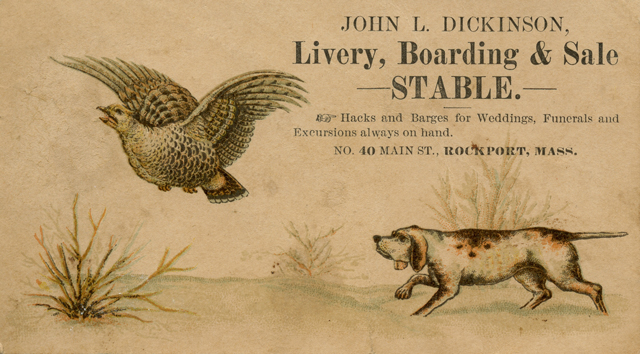 Before they became popular as souvenirs, postcards were used for advertising. This beautifully illustrated card advertises John L. Dickinson’s stable at 40 Main Street, Rockport. The address is right across from where Main St. and Beach St. intersect. A house is there now.