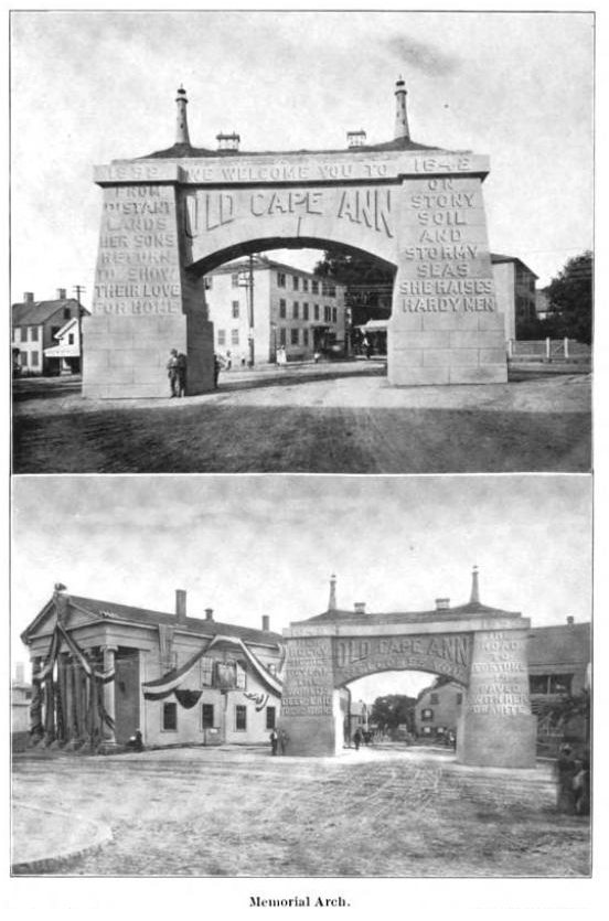 For the celebration of its 250th anniversary in 1892, Gloucester erected this memorial arch adjacent to the former town hall, now the American Legion building, on Washington St. The original plan called for two such arches, one on Dale Avenue and another on Western Ave. just beyond the Cut bridge. This was the design originally planned for Western Ave. When the plan was eventually scaled back to just one arch, it was thought best to locate it on Washington St.