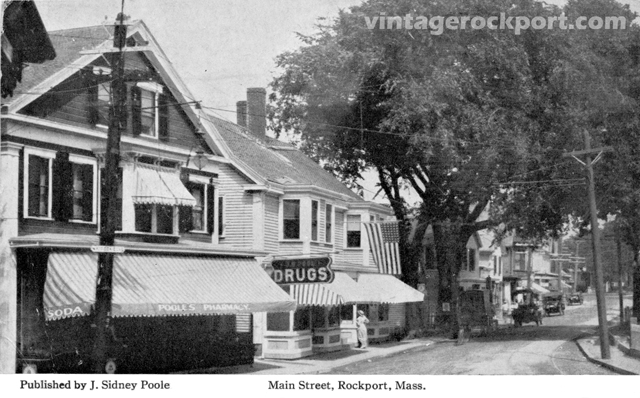 This postcard was published by J. Sidney Poole and shows Poole’s Pharmacy, the drugstore he operated at the corner of Main and Beach streets. I believe he lived upstairs from the pharmacy.