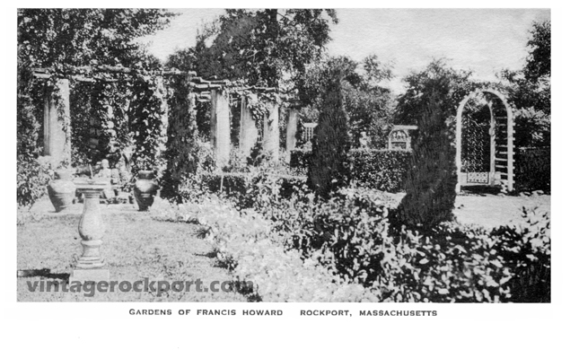 Francis G. Howard was a nationally prominent landscape architect widely known for his designs of gardens and garden furniture and ornaments. Born in Maine in 1869, he lived in New York City and summered in Rockport, where he had a studio. He died in 1937. I do not know where his home was here and would appreciate hearing from anyone who does know. I assume the gardens shown here were at his home, but I do not know that.