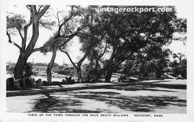 Today, the 4th of July, Back Beach in Rockport will be the scene of an enormous bonfire watched by hundreds. But Back Beach once looked much different than it does today. Where the road along the beach now offers an unobstructed view of the ocean beyond, the road was once lined with willow and oak trees, as this postcard shows.