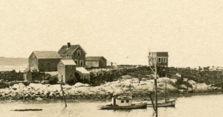 Note the tower farthest to the right on Bearskin Neck. It appears to be the transit tower that was erected in 1892 and still stands there. However, whereas the tower today is attached to a larger building, it was freestanding then and appears to be supported on stilts. (I have enlarged the tower detail in the image to the right.)