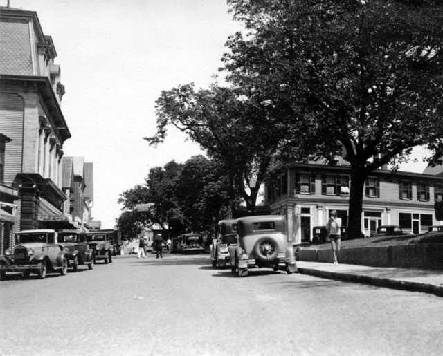 The scene looks east on Main Street. The building to the left was replaced by the Shalin Liu Performance Center. The lawn to the right is the front of the Congregational Church. The building on the right, behind the girl on the sidewalk, housed the Granite Shore Inn and, directly on the corner, the Post Office. Down the street, a police officer stops traffic as a dapperly dressed couple crosses the street.