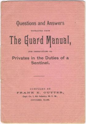From 1887 to 1894, he was captain of the Concord Artillery, which later became Company 1, 6th Infantry, of the Massachusetts Volunteer Militia. (It appears he continued as a reserve officer at least into the early 1900s.) He wrote two military manuals, the Manual of Military Courtesy and Guard Duty in 1889 and Questions and Answers Extracted from The Guard Manual for Instruction to Privates in the Duties of a Sentinel, sometime in the late 1880s. In the 1894 re-enactment of the 1775 Revolutionary War battle at Concord, Capt. Cutter led the company of Minutemen.