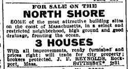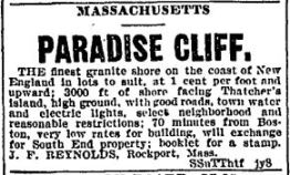 Paradise Cliff. The finest granite shore on the coast of New England in lots to suit, at 1 cent per foot and upward; 3000 ft of shore facing Thatcher’s Island, high ground, with good roads, town water and electric lights, select neighborhood and reasonable restrictions; 70 minutes from Boston, very low rates for building, will exchange for South End property; booklet for a stamp. J.F. REYNOLDS, Rockport, Mass.