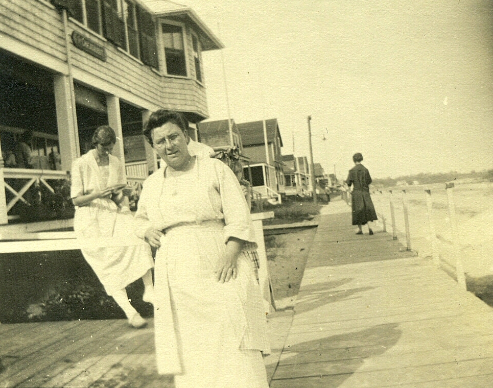The top three photos are all from that first visit in 1920. At top, in front of the Long Beach sign (probably the one you see in this image), the man with two children is Charles Matthews with his daughter Jean and son Bill. The second photo shows Charles’ wife Eleanor. In the third photo, Bill and Jean sit with other children on the porch.