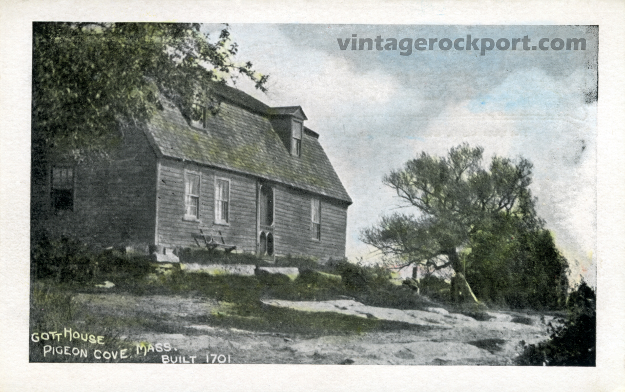 The postcard of “The Old House'” is not of the Gott House, but of the Garrison House, or also known as the Witch House at 189 Granite Street. My family owned that house for many years (my grandparents Oliver E Wiiliams and Esther Balwin Williams bought it Lin 1026) and my father, architect Thomas Williams did extensive tea search on it. The date of the house is controversial. But my father found a reference to a garrison built near Pigeon Cove Harbour on 1689, which seems to have referred to this house, which was only one room at the time and later extended when owned by a family that were farmers. It was called the Witch House because Elizabeth Proctor of Salem, accused of being a witch, but pregnant, was said to been sent here to have her baby.
