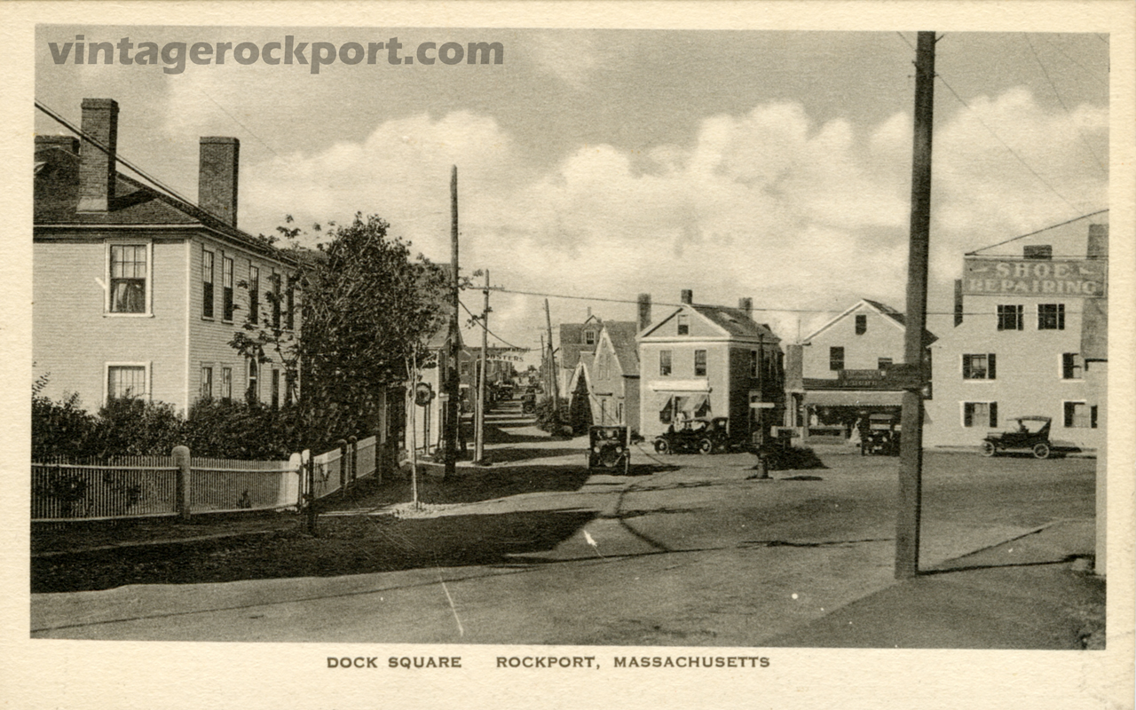 A shoe repair sign is prominent on the right side of this circa 1928 view of Dock Square in Rockport. It is difficult to make out here, but on the road out to Bearskin Neck, near the center of the image, is a banner strung between two light poles displaying the word “Lobsters.”