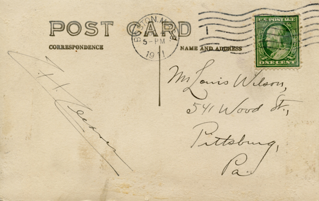 It seems safe to assume that Cleaves also took this picture. He was an avid photographer and produced many postcards through his Rockport Photo Bureau. This was not a commercial postcard, however, but a real photo postcard, meaning that it was an actual photograph mounted on postcard stock for mailing. The reverse (see below) is addressed to someone in Pittsburgh, Penn., and postmarked Aug. 4, 1911. It has no note, but bears what appears to be Cleaves’ signature. My guess is that he was sending this to someone who was interested in the property.