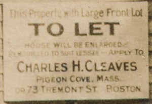 To the right you see an enlargement of the sign on the building in this picture. It indicates that the entire property, including a “large front lot,” is available, and that the “house will be enlarged” to suit the lessee. It indicates that inquiries should be sent to Charles H. Cleaves, who we may presume was handling it in his capacity as an attorney.